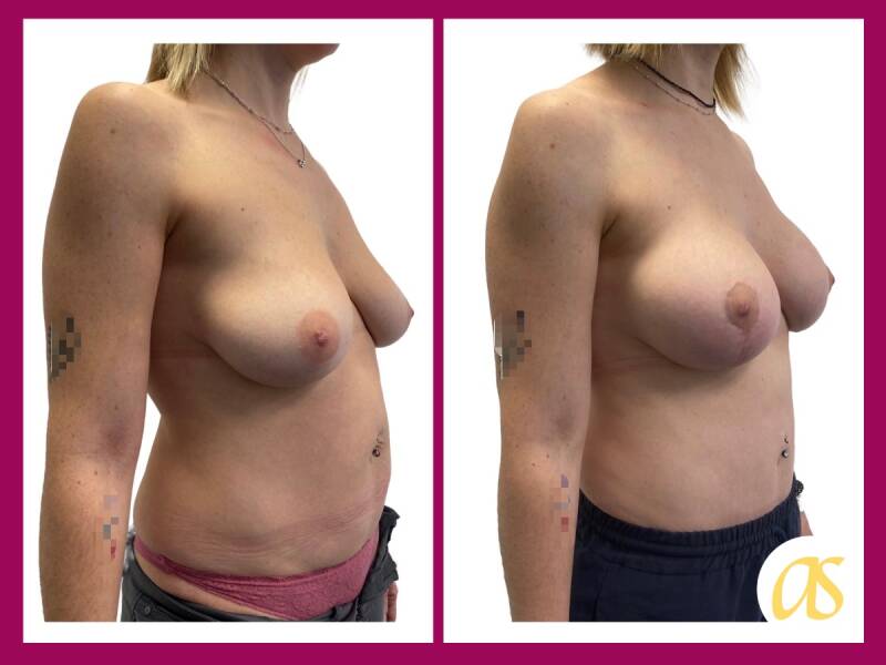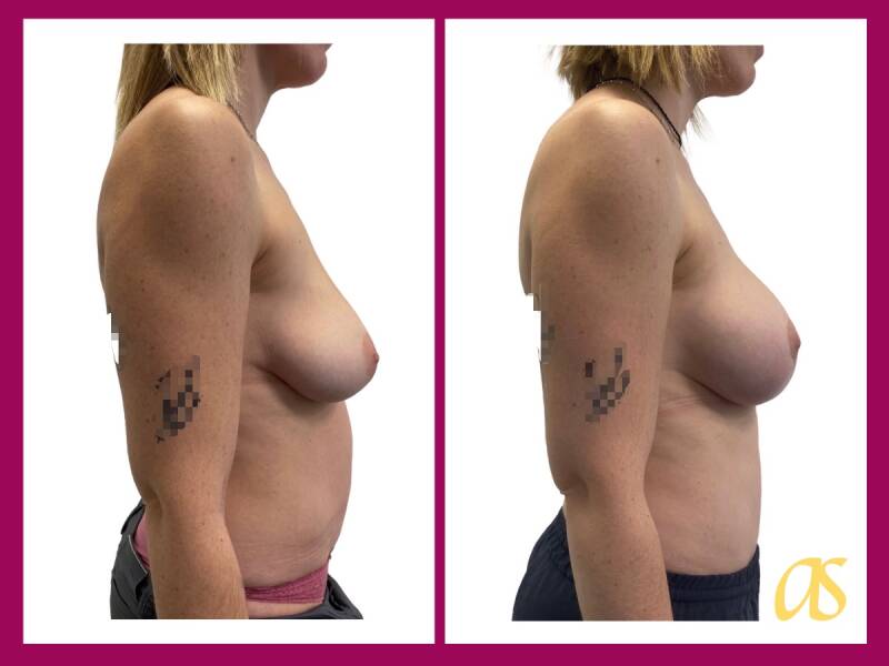 Mujer joven que tras varios embarazos presenta los senos caídos con un polo superior vacío y una asimetría evidente. Pese a estar delgada el abdomen presenta un aspecto globuloso por la diástasis abdominal. Elevación mamaria con cicatriz en T invertida y aumento mamario con implante de 220cc + miniabdominoplastia con ombligo flotante y plicatura de los músculos rectos abdominales + liposucción de flancos y abdomen.